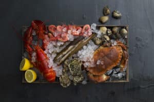 STOCKFOOD_12623043-RFLobster-prawns-mussels-and-crab-on-ice